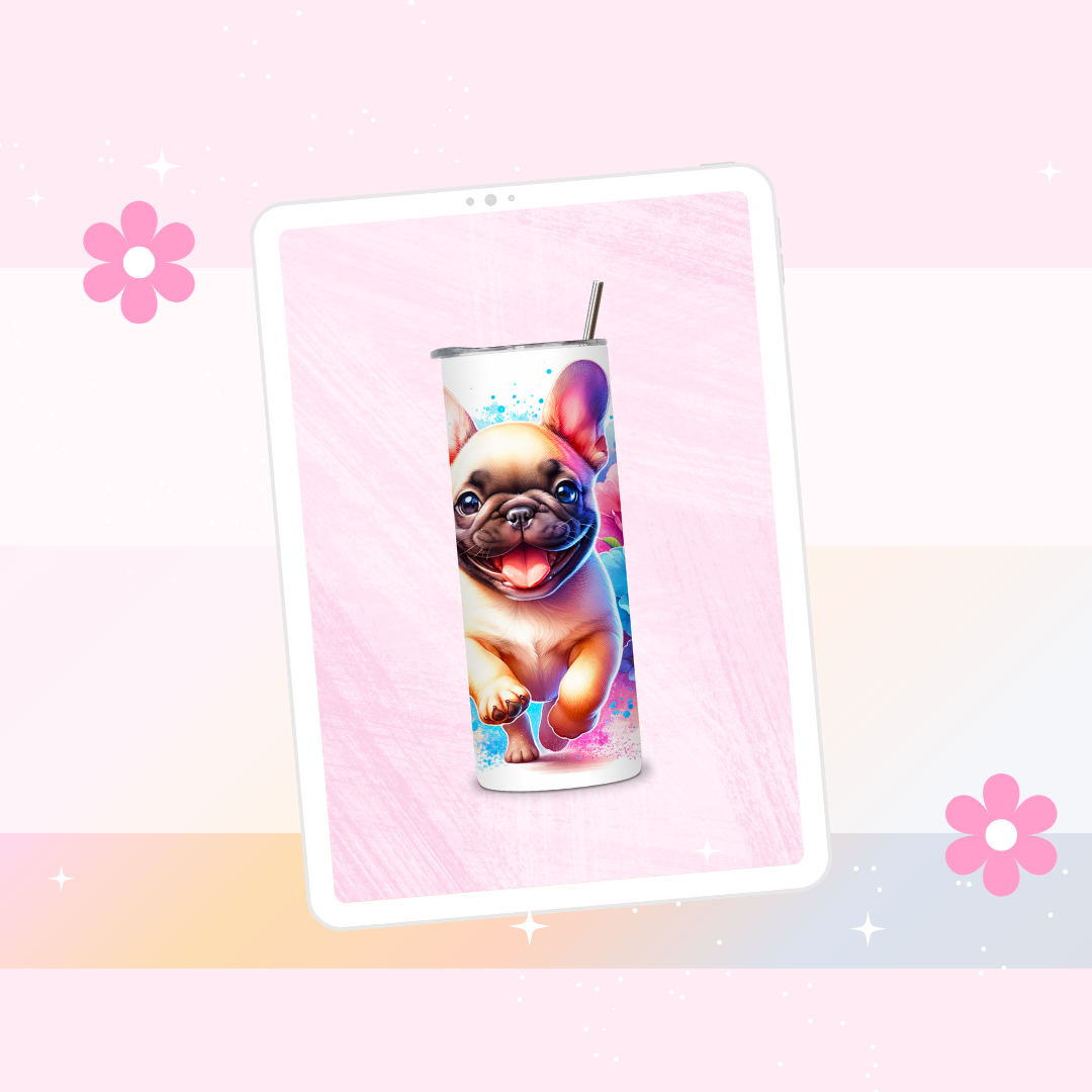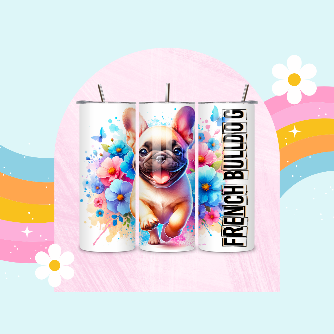 French bulldog drinks tumbler