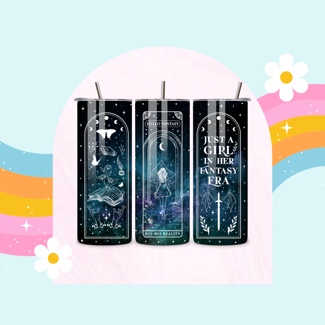 Escape into your favorite world of dragons, dark princes, and fae warriors—this tumbler was made for fantasy lovers living their best bookish life. Featuring a dreamy, bold “Just a Girl in Her Fantasy Era” design, it’s the ultimate companion for cozy reading sessions, late-night fanfic dives, and magical daydreams.