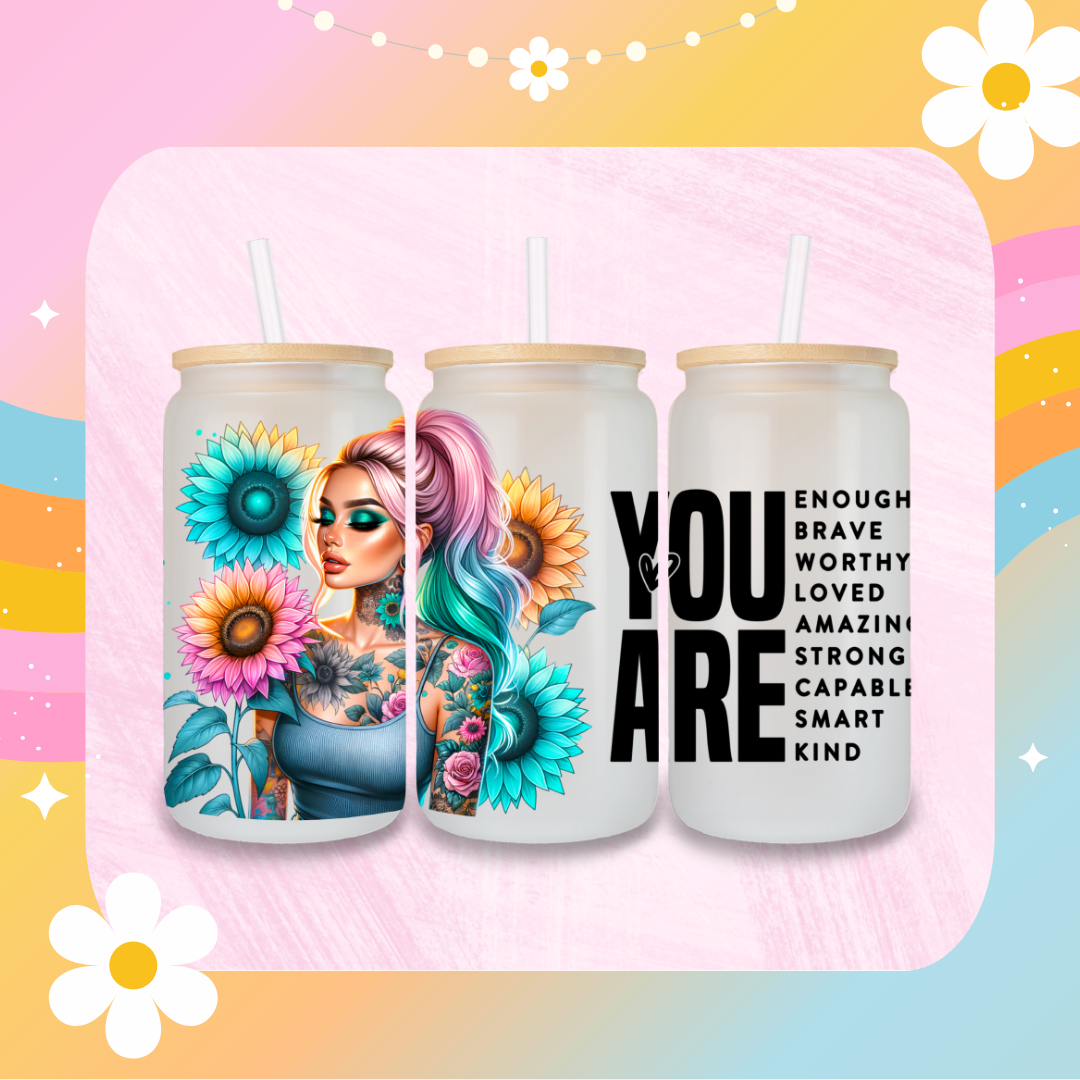 Each tumbler includes a natural bamboo lid and a reusable glass straw, making it both beautiful and planet-friendly. The high-quality sublimation printing ensures your chosen design is vibrant, waterproof, and long-lasting, ready to brighten your day again and again.